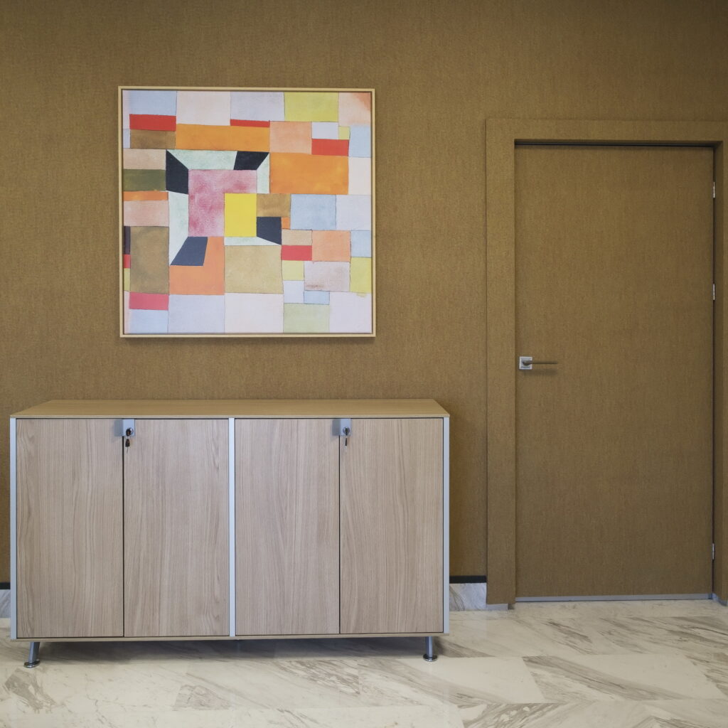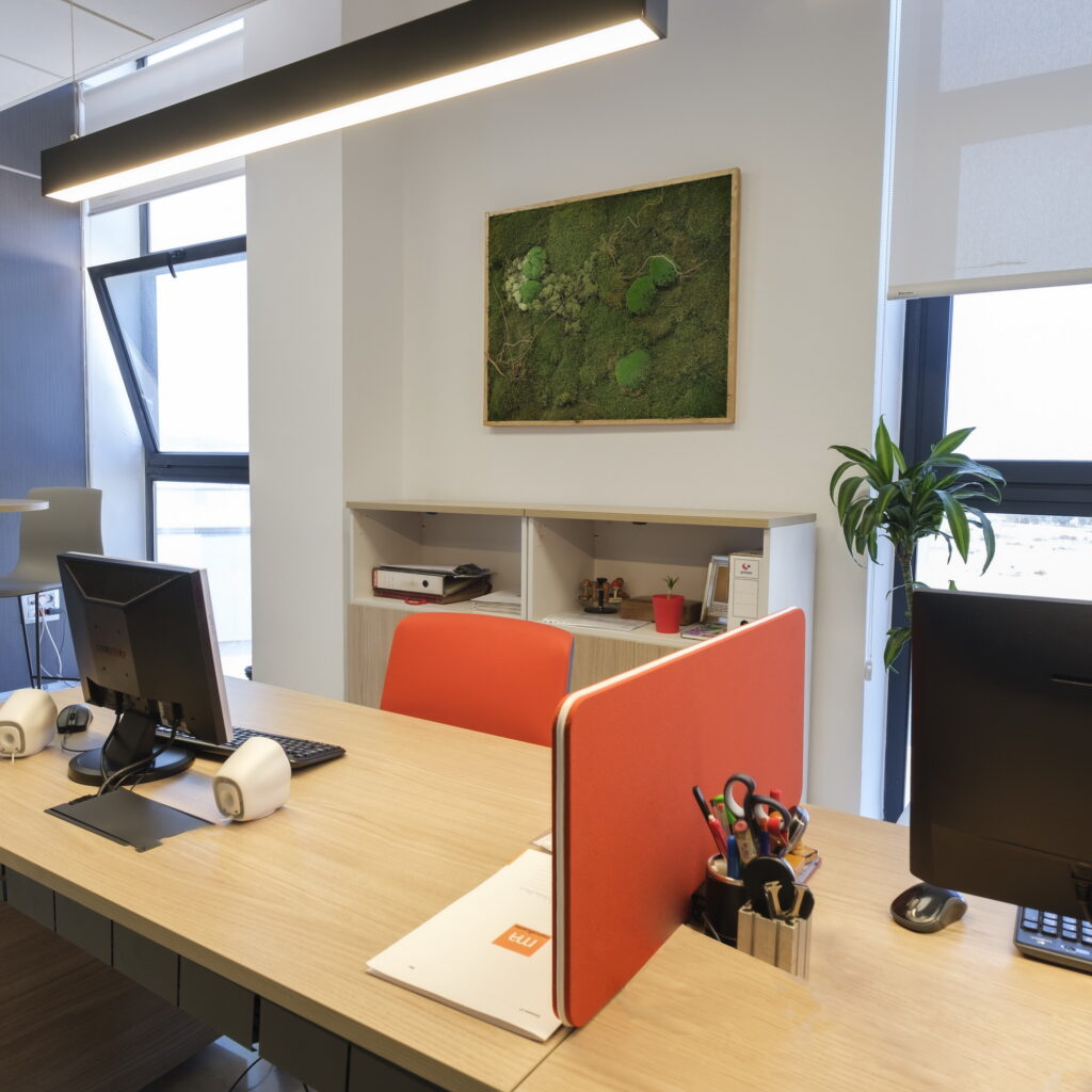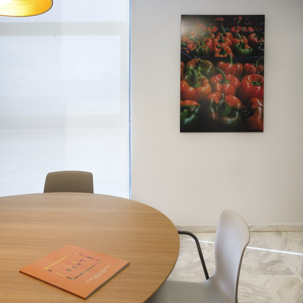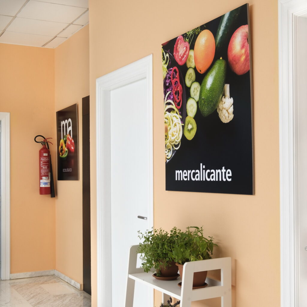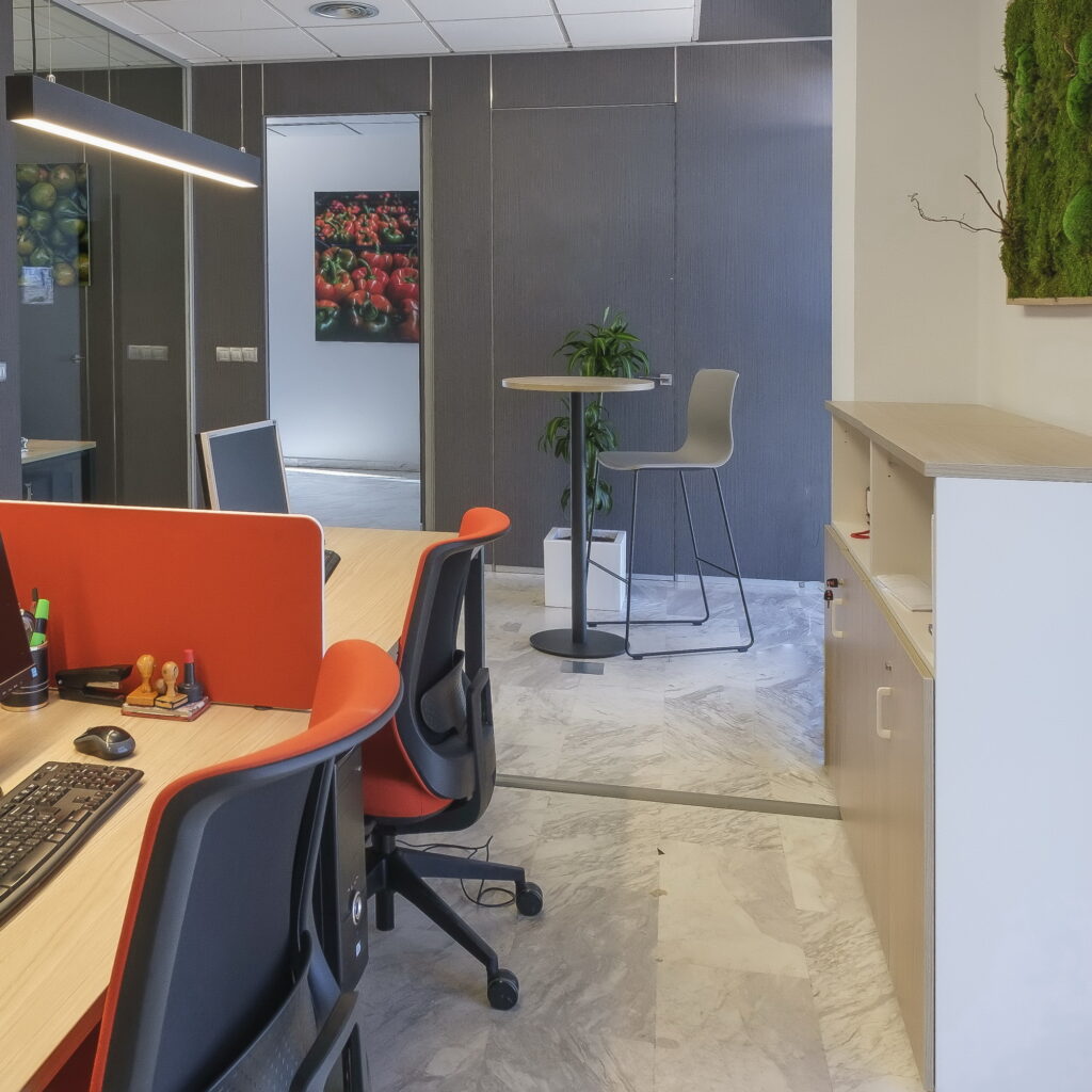 Incorporación de mobiliario de la firma Actiu con los colores corporativos de Mercalicante. Renovación de paredes con pintura y papel pintado. Instalación de luminarias suspendidas sobre las mesas de trabajo. Decoración de la zona administrativa con cuadros de musgo preservado, murales fotográficos corporativos y panorámicas de Alicante en la sala de juntas.